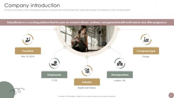 This slide covers a company overview of the baby2body enterprise. It includes information such as foundation date, company status, employee count, headquarters, industry, and market segment. Slidegeeks is one of the best resources for PowerPoint templates. You can download easily and regulate Company Introduction Women Wellness Coaching Platform Pitch Deck for your personal presentations from our wonderful collection. A few clicks is all it takes to discover and get the most relevant and appropriate templates. Use our Templates to add a unique zing and appeal to your presentation and meetings. All the slides are easy to edit and you can use them even for advertisement purposes. This slide covers a company overview of the baby2body enterprise. It includes information such as foundation date, company status, employee count, headquarters, industry, and market segment.