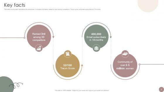 This slide covers major facts about the enterprise. It includes information related to rank among competitors, Tracxn score, and email subscribers in 18 months. Find highly impressive Key Facts Women Wellness Coaching Platform Pitch Deck on Slidegeeks to deliver a meaningful presentation. You can save an ample amount of time using these presentation templates. No need to worry to prepare everything from scratch because Slidegeeks experts have already done a huge research and work for you. You need to download Key Facts Women Wellness Coaching Platform Pitch Deck for your upcoming presentation. All the presentation templates are 100 percent editable and you can change the color and personalize the content accordingly. Download now This slide covers major facts about the enterprise. It includes information related to rank among competitors, Tracxn score, and email subscribers in 18 months.
