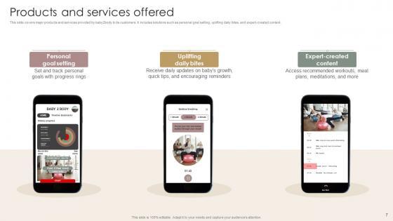 This slide covers major products and services provided by baby2body to its customers. It includes solutions such as personal goal setting, uplifting daily bites, and expert-created content. Formulating a presentation can take up a lot of effort and time, so the content and message should always be the primary focus. The visuals of the PowerPoint can enhance the presenters message, so our Products And Services Offered Women Wellness Coaching Platform Pitch Deck was created to help save time. Instead of worrying about the design, the presenter can concentrate on the message while our designers work on creating the ideal templates for whatever situation is needed. Slidegeeks has experts for everything from amazing designs to valuable content, we have put everything into Products And Services Offered Women Wellness Coaching Platform Pitch Deck This slide covers major products and services provided by baby2body to its customers. It includes solutions such as personal goal setting, uplifting daily bites, and expert-created content.