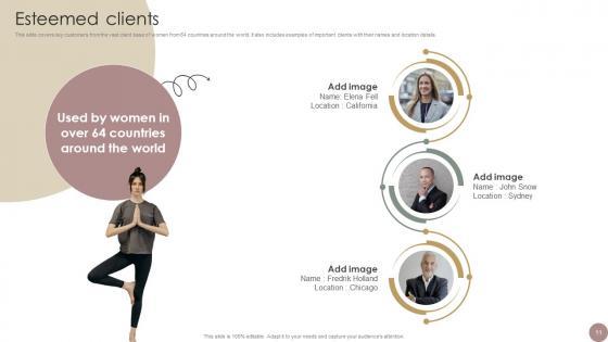 This slide covers key customers from the vast client base of women from 64 countries around the world. It also includes examples of important clients with their names and location details. Do you have to make sure that everyone on your team knows about any specific topic I yes, then you should give Esteemed Clients Women Wellness Coaching Platform Pitch Deck a try. Our experts have put a lot of knowledge and effort into creating this impeccable Esteemed Clients Women Wellness Coaching Platform Pitch Deck. You can use this template for your upcoming presentations, as the slides are perfect to represent even the tiniest detail. You can download these templates from the Slidegeeks website and these are easy to edit. So grab these today This slide covers key customers from the vast client base of women from 64 countries around the world. It also includes examples of important clients with their names and location details.