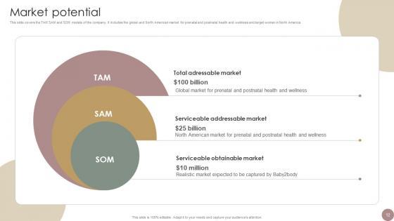 This slide covers the TAM SAM and SOM models of the company. It includes the global and North American market for prenatal and postnatal health and wellness and target women in North America. If you are looking for a format to display your unique thoughts, then the professionally designed Market Potential Women Wellness Coaching Platform Pitch Deck is the one for you. You can use it as a Google Slides template or a PowerPoint template. Incorporate impressive visuals, symbols, images, and other charts. Modify or reorganize the text boxes as you desire. Experiment with shade schemes and font pairings. Alter, share or cooperate with other people on your work. Download Market Potential Women Wellness Coaching Platform Pitch Deck and find out how to give a successful presentation. Present a perfect display to your team and make your presentation unforgettable. This slide covers the TAM SAM and SOM models of the company. It includes the global and North American market for prenatal and postnatal health and wellness and target women in North America.