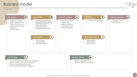 This slide covers the business model canvas for the baby2body app. It includes information about key partners, key activities, value proposition, key resources, distribution channels, customer relationships, customer segments, cost structure, and revenue streams. Boost your pitch with our creative Business Model Women Wellness Coaching Platform Pitch Deck. Deliver an awe-inspiring pitch that will mesmerize everyone. Using these presentation templates you will surely catch everyones attention. You can browse the ppts collection on our website. We have researchers who are experts at creating the right content for the templates. So you do not have to invest time in any additional work. Just grab the template now and use them. This slide covers the business model canvas for the baby2body app. It includes information about key partners, key activities, value proposition, key resources, distribution channels, customer relationships, customer segments, cost structure, and revenue streams.