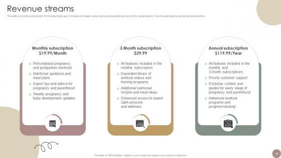 This slide covers the pricing model for the baby2body app. It includes information about various pricing plans such as monthly subscriptions, 3-month subscriptions, and annual subscriptions. Coming up with a presentation necessitates that the majority of the effort goes into the content and the message you intend to convey. The visuals of a PowerPoint presentation can only be effective if it supplements and supports the story that is being told. Keeping this in mind our experts created Revenue Streams Women Wellness Coaching Platform Pitch Deck to reduce the time that goes into designing the presentation. This way, you can concentrate on the message while our designers take care of providing you with the right template for the situation. This slide covers the pricing model for the baby2body app. It includes information about various pricing plans such as monthly subscriptions, 3-month subscriptions, and annual subscriptions.