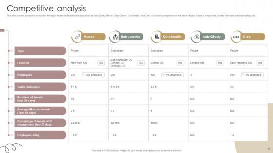 This slide covers competitor evaluation for major fitness and healthcare apps such as baby2body, Maven, BabyCenter, Ovia Health, and Cleo. It includes comparison on the basis of type, location, employees, twitter followers, employee rating, etc. Want to ace your presentation in front of a live audience Our Competitive Analysis Women Wellness Coaching Platform Pitch Deck can help you do that by engaging all the users towards you. Slidegeeks experts have put their efforts and expertise into creating these impeccable powerpoint presentations so that you can communicate your ideas clearly. Moreover, all the templates are customizable, and easy-to-edit and downloadable. Use these for both personal and commercial use. This slide covers competitor evaluation for major fitness and healthcare apps such as baby2body, Maven, BabyCenter, Ovia Health, and Cleo. It includes comparison on the basis of type, location, employees, twitter followers, employee rating, etc.