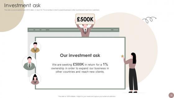 This slide covers investment ask of dollar 10 million in return for 1 percent ownership in order to expand business in other countries and reach new customers. Whether you have daily or monthly meetings, a brilliant presentation is necessary. Investment Ask Women Wellness Coaching Platform Pitch Deck can be your best option for delivering a presentation. Represent everything in detail using Investment Ask Women Wellness Coaching Platform Pitch Deck and make yourself stand out in meetings. The template is versatile and follows a structure that will cater to your requirements. All the templates prepared by Slidegeeks are easy to download and edit. Our research experts have taken care of the corporate themes as well. So, give it a try and see the results. This slide covers investment ask of dollar 10 million in return for 1 percent ownership in order to expand business in other countries and reach new customers.