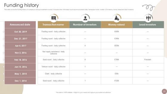 This slide covers the funding history of companys various investment rounds, it includes other information such as announcement date, transaction name, number of investors, money raised and lead investors. Slidegeeks is here to make your presentations a breeze with Funding History Women Wellness Coaching Platform Pitch Deck With our easy-to-use and customizable templates, you can focus on delivering your ideas rather than worrying about formatting. With a variety of designs to choose from, you are sure to find one that suits your needs. And with animations and unique photos, illustrations, and fonts, you can make your presentation pop. So whether you are giving a sales pitch or presenting to the board, make sure to check out Slidegeeks first This slide covers the funding history of companys various investment rounds, it includes other information such as announcement date, transaction name, number of investors, money raised and lead investors.