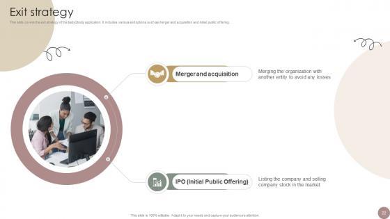 This slide covers the exit strategy of the baby2body application. It includes various exit options such as merger and acquisition and initial public offering. Get a simple yet stunning designed Exit Strategy Women Wellness Coaching Platform Pitch Deck. It is the best one to establish the tone in your meetings. It is an excellent way to make your presentations highly effective. So, download this PPT today from Slidegeeks and see the positive impacts. Our easy-to-edit Exit Strategy Women Wellness Coaching Platform Pitch Deck can be your go-to option for all upcoming conferences and meetings. So, what are you waiting for Grab this template today. This slide covers the exit strategy of the baby2body application. It includes various exit options such as merger and acquisition and initial public offering.