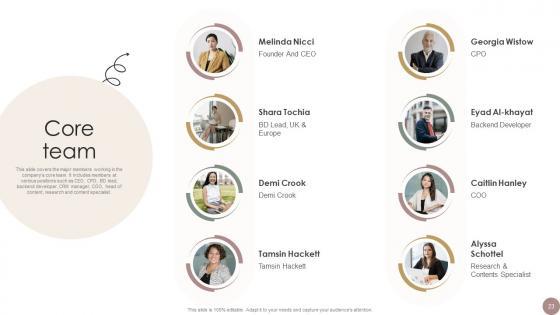 This slide covers the major members working in the companys core team. It includes members at various positions such as CEO, CPO, BD lead, backend developer, CRM manager, COO, head of content, research and content specialist. There are so many reasons you need a Core Team Women Wellness Coaching Platform Pitch Deck. The first reason is you can not spend time making everything from scratch, Thus, Slidegeeks has made presentation templates for you too. You can easily download these templates from our website easily. This slide covers the major members working in the companys core team. It includes members at various positions such as CEO, CPO, BD lead, backend developer, CRM manager, COO, head of content, research and content specialist.