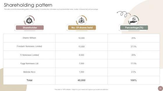 This slide covers the shareholding pattern of the company. It includes other information such as shareholder name, number of shares held, and percentage. This modern and well-arranged Shareholding Pattern Women Wellness Coaching Platform Pitch Deck provides lots of creative possibilities. It is very simple to customize and edit with the Powerpoint Software. Just drag and drop your pictures into the shapes. All facets of this template can be edited with Powerpoint, no extra software is necessary. Add your own material, put your images in the places assigned for them, adjust the colors, and then you can show your slides to the world, with an animated slide included. This slide covers the shareholding pattern of the company. It includes other information such as shareholder name, number of shares held, and percentage.