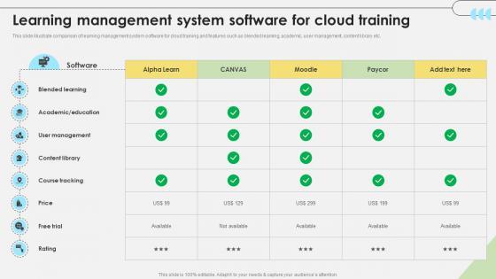 This slide illustrate comparison of learning management system software for cloud training and features such as blended learning, academic, user management, content library etc. Explore a selection of the finest Workforce Competency Enhancement Learning Management System Software For Cloud Training DTE SS V here. With a plethora of professionally designed and pre-made slide templates, you can quickly and easily find the right one for your upcoming presentation. You can use our Workforce Competency Enhancement Learning Management System Software For Cloud Training DTE SS V to effectively convey your message to a wider audience. Slidegeeks has done a lot of research before preparing these presentation templates. The content can be personalized and the slides are highly editable. Grab templates today from Slidegeeks. This slide illustrate comparison of learning management system software for cloud training and features such as blended learning, academic, user management, content library etc.