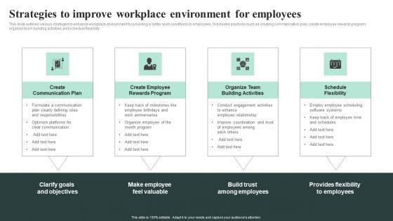 This slide outlines various strategies to enhance workplace environment for providing a better work conditions to employees. It includes practices such as creating communication plan, create employee rewards program, organize team building activities and schedule flexibility. Do you have to make sure that everyone on your team knows about any specific topic I yes, then you should give Creating Employee Value Proposition Strategies To Improve Workplace Environment For Template PDF a try. Our experts have put a lot of knowledge and effort into creating this impeccable Creating Employee Value Proposition Strategies To Improve Workplace Environment For Template PDF. You can use this template for your upcoming presentations, as the slides are perfect to represent even the tiniest detail. You can download these templates from the Slidegeeks website and these are easy to edit. So grab these today.