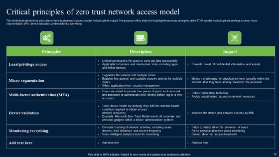 This slide illustrates the key principles of zero trust network access model, including their impact. The purpose of this slide is to highlight the primary principles of the ZTNA model, including least privilege access, micro-segmentation, MFA, device validation, and monitoring everything. Do you have an important presentation coming up Are you looking for something that will make your presentation stand out from the rest Look no further than Critical Principles Of Zero Trust Network Access Security Formats Pdf. With our professional designs, you can trust that your presentation will pop and make delivering it a smooth process. And with Slidegeeks, you can trust that your presentation will be unique and memorable. So why wait Grab Critical Principles Of Zero Trust Network Access Security Formats Pdf today and make your presentation stand out from the rest This slide illustrates the key principles of zero trust network access model, including their impact. The purpose of this slide is to highlight the primary principles of the ZTNA model, including least privilege access, micro-segmentation, MFA, device validation, and monitoring everything.