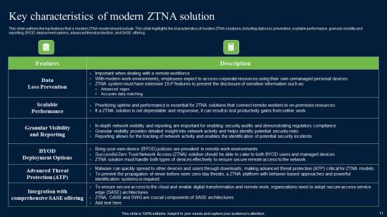 This slide outlines the top features that a modern ZTNA model should include. This slide highlights the characteristics of modern ZTNA solutions, including data loss prevention, scalable performance, granular visibility and reporting, BYOD deployment options, advanced threat protection, and SASE offering. Coming up with a presentation necessitates that the majority of the effort goes into the content and the message you intend to convey. The visuals of a PowerPoint presentation can only be effective if it supplements and supports the story that is being told. Keeping this in mind our experts created Key Characteristics Of Modern ZTNA Solution Zero Trust Network Security Formats Pdf to reduce the time that goes into designing the presentation. This way, you can concentrate on the message while our designers take care of providing you with the right template for the situation. This slide outlines the top features that a modern ZTNA model should include. This slide highlights the characteristics of modern ZTNA solutions, including data loss prevention, scalable performance, granular visibility and reporting, BYOD deployment options, advanced threat protection, and SASE offering.