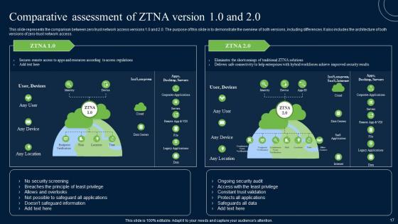 This slide represents the comparison between zero trust network access versions 1.0 and 2.0. The purpose of this slide is to demonstrate the overview of both versions, including differences. It also includes the architecture of both versions of zero-trust network access. From laying roadmaps to briefing everything in detail, our templates are perfect for you. You can set the stage with your presentation slides. All you have to do is download these easy-to-edit and customizable templates. Comparative Assessment Of ZTNA Version 10 And 20 Zero Trust Network Security Infographics Pdf will help you deliver an outstanding performance that everyone would remember and praise you for. Do download this presentation today. This slide represents the comparison between zero trust network access versions 1.0 and 2.0. The purpose of this slide is to demonstrate the overview of both versions, including differences. It also includes the architecture of both versions of zero-trust network access.