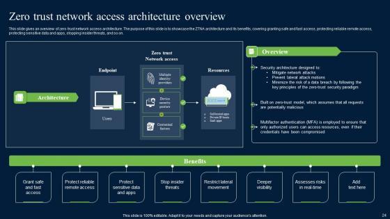 This slide gives an overview of zero trust network access architecture. The purpose of this slide is to showcase the ZTNA architecture and its benefits, covering granting safe and fast access, protecting reliable remote access, protecting sensitive data and apps, stopping insider threats, and so on. If your project calls for a presentation, then Slidegeeks is your go-to partner because we have professionally designed, easy-to-edit templates that are perfect for any presentation. After downloading, you can easily edit Zero Trust Network Security Access Architecture Overview Graphics Pdf and make the changes accordingly. You can rearrange slides or fill them with different images. Check out all the handy templates This slide gives an overview of zero trust network access architecture. The purpose of this slide is to showcase the ZTNA architecture and its benefits, covering granting safe and fast access, protecting reliable remote access, protecting sensitive data and apps, stopping insider threats, and so on.