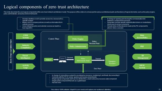 This slide describes the core logical components of the zero-trust network architecture model. The purpose of this slide is to showcase the various architectural parts and functions of logical elements, such as the policy engine, policy administrator, and policy environment point. This Logical Components Of Zero Trust Architecture Zero Trust Network Security Pictures Pdf is perfect for any presentation, be it in front of clients or colleagues. It is a versatile and stylish solution for organizing your meetings. The Logical Components Of Zero Trust Architecture Zero Trust Network Security Pictures Pdf features a modern design for your presentation meetings. The adjustable and customizable slides provide unlimited possibilities for acing up your presentation. Slidegeeks has done all the homework before launching the product for you. So, do not wait, grab the presentation templates today This slide describes the core logical components of the zero-trust network architecture model. The purpose of this slide is to showcase the various architectural parts and functions of logical elements, such as the policy engine, policy administrator, and policy environment point.