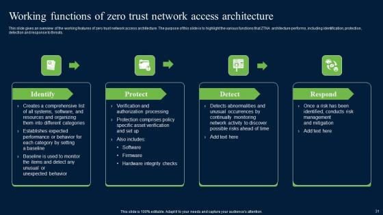 This slide gives an overview of the working features of zero trust network access architecture. The purpose of this slide is to highlight the various functions that ZTNA architecture performs, including identification, protection, detection and response to threats. Create an editable Working Functions Of Zero Trust Network Access Security Infographics Pdf that communicates your idea and engages your audience. Whether you are presenting a business or an educational presentation, pre-designed presentation templates help save time. Working Functions Of Zero Trust Network Access Security Infographics Pdf is highly customizable and very easy to edit, covering many different styles from creative to business presentations. Slidegeeks has creative team members who have crafted amazing templates. So, go and get them without any delay. This slide gives an overview of the working features of zero trust network access architecture. The purpose of this slide is to highlight the various functions that ZTNA architecture performs, including identification, protection, detection and response to threats.