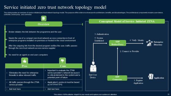 This slide provides an overview of service initiated zero-trust network topology model. The purpose of this slide is to showcase its architecture, benefits, and disadvantages. The architectural components include a user device, controller, broker proxy, and connector. Find a pre-designed and impeccable Service Initiated Zero Trust Network Topology Model Zero Trust Network Security Guidelines Pdf. The templates can ace your presentation without additional effort. You can download these easy-to-edit presentation templates to make your presentation stand out from others. So, what are you waiting for Download the template from Slidegeeks today and give a unique touch to your presentation. This slide provides an overview of service initiated zero-trust network topology model. The purpose of this slide is to showcase its architecture, benefits, and disadvantages. The architectural components include a user device, controller, broker proxy, and connector.