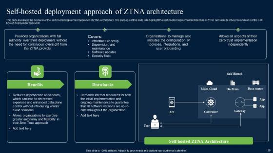 This slide illustrates the overview of the self-hosted deployment approach of ZTNA architecture. The purpose of this slide is to highlight the self-hosted deployment architecture of ZTNA and includes the pros and cons of the self-hosted deployment approach. Do you know about Slidesgeeks Self Hosted Deployment Approach Of ZTNA Architecture Zero Trust Network Security Graphics Pdf These are perfect for delivering any kind od presentation. Using it, create PowerPoint presentations that communicate your ideas and engage audiences. Save time and effort by using our pre-designed presentation templates that are perfect for a wide range of topic. Our vast selection of designs covers a range of styles, from creative to business, and are all highly customizable and easy to edit. Download as a PowerPoint template or use them as Google Slides themes. This slide illustrates the overview of the self-hosted deployment approach of ZTNA architecture. The purpose of this slide is to highlight the self-hosted deployment architecture of ZTNA and includes the pros and cons of the self-hosted deployment approach.