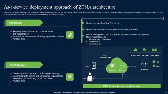 This slide outlines the overview of the as-a-service implementation approach of ZTNA architecture. The purpose of this slide is to highlight the ZTNA as a service architecture, including its advantages and disadvantages. The pros include fewer internal resources requirements and reassurance of up-to-date software. Boost your pitch with our creative As A Service Deployment Approach Zero Trust Network Security Microsoft Pdf. Deliver an awe-inspiring pitch that will mesmerize everyone. Using these presentation templates you will surely catch everyones attention. You can browse the ppts collection on our website. We have researchers who are experts at creating the right content for the templates. So you do not have to invest time in any additional work. Just grab the template now and use them. This slide outlines the overview of the as-a-service implementation approach of ZTNA architecture. The purpose of this slide is to highlight the ZTNA as a service architecture, including its advantages and disadvantages. The pros include fewer internal resources requirements and reassurance of up-to-date software.