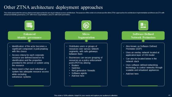 This slide represents the various deployment approaches for zero-trust network access architecture. The purpose of this slide is to showcase the other ZTNA approaches for architecture implementation and these are ZTA with enhanced identity governance, ZTA with micro-segmentation, and ZTA with SDN perimeters. Retrieve professionally designed Other ZTNA Architecture Deployment Approaches Zero Trust Network Security Introduction Pdf to effectively convey your message and captivate your listeners. Save time by selecting pre-made slideshows that are appropriate for various topics, from business to educational purposes. These themes come in many different styles, from creative to corporate, and all of them are easily adjustable and can be edited quickly. Access them as PowerPoint templates or as Google Slides themes. You do not have to go on a hunt for the perfect presentation because Slidegeeks got you covered from everywhere. This slide represents the various deployment approaches for zero-trust network access architecture. The purpose of this slide is to showcase the other ZTNA approaches for architecture implementation and these are ZTA with enhanced identity governance, ZTA with micro-segmentation, and ZTA with SDN perimeters.