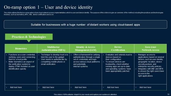This slide outlines the first on-ramp option of zero trust network access implementation, which is user and device identity. The purpose of this slide is to give an overview of the method, including the practices and technologies involved, such as biometrics, MFA, IAM, device certification and so on. The best PPT templates are a great way to save time, energy, and resources. Slidegeeks have 100 percent editable powerpoint slides making them incredibly versatile. With these quality presentation templates, you can create a captivating and memorable presentation by combining visually appealing slides and effectively communicating your message. Download On Ramp Option 1 User And Device Identity Zero Trust Network Security Mockup Pdf from Slidegeeks and deliver a wonderful presentation. This slide outlines the first on-ramp option of zero trust network access implementation, which is user and device identity. The purpose of this slide is to give an overview of the method, including the practices and technologies involved, such as biometrics, MFA, IAM, device certification and so on.