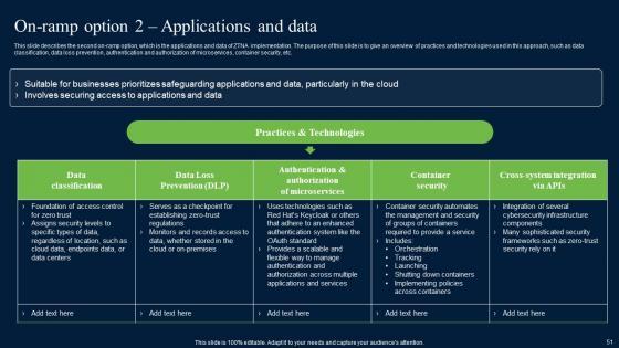 This slide describes the second on-ramp option, which is the applications and data of ZTNA implementation. The purpose of this slide is to give an overview of practices and technologies used in this approach, such as data classification, data loss prevention, authentication and authorization of microservices, container security, etc. The On Ramp Option 2 Applications And Data Zero Trust Network Security Sample Pdf is a compilation of the most recent design trends as a series of slides. It is suitable for any subject or industry presentation, containing attractive visuals and photo spots for businesses to clearly express their messages. This template contains a variety of slides for the user to input data, such as structures to contrast two elements, bullet points, and slides for written information. Slidegeeks is prepared to create an impression. This slide describes the second on-ramp option, which is the applications and data of ZTNA implementation. The purpose of this slide is to give an overview of practices and technologies used in this approach, such as data classification, data loss prevention, authentication and authorization of microservices, container security, etc.