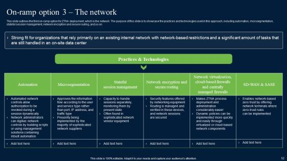 This slide outlines the third on-ramp option for ZTNA deployment, which is the network. The purpose of this slide is to showcase the practices and technologies used in this approach, including automation, microsegmentation, stateful session management, network encryption and secure routing, and so on. Are you searching for a On Ramp Option 3 The Network Zero Trust Network Security Information Pdf that is uncluttered, straightforward, and original Its easy to edit, and you can change the colors to suit your personal or business branding. For a presentation that expresses how much effort you have put in, this template is ideal With all of its features, including tables, diagrams, statistics, and lists, its perfect for a business plan presentation. Make your ideas more appealing with these professional slides. Download On Ramp Option 3 The Network Zero Trust Network Security Information Pdf from Slidegeeks today. This slide outlines the third on-ramp option for ZTNA deployment, which is the network. The purpose of this slide is to showcase the practices and technologies used in this approach, including automation, microsegmentation, stateful session management, network encryption and secure routing, and so on.