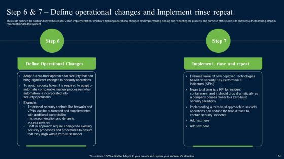 This slide outlines the sixth and seventh steps for ZTNA implementation, which are defining operational changes and implementing, rinsing and repeating the process. The purpose of this slide is to showcase the following steps in zero trust model deployment. Do you have to make sure that everyone on your team knows about any specific topic I yes, then you should give Step 6 And 7 Define Operational Changes And Zero Trust Network Security Diagrams Pdf a try. Our experts have put a lot of knowledge and effort into creating this impeccable Step 6 And 7 Define Operational Changes And Zero Trust Network Security Diagrams Pdf. You can use this template for your upcoming presentations, as the slides are perfect to represent even the tiniest detail. You can download these templates from the Slidegeeks website and these are easy to edit. So grab these today This slide outlines the sixth and seventh steps for ZTNA implementation, which are defining operational changes and implementing, rinsing and repeating the process. The purpose of this slide is to showcase the following steps in zero trust model deployment.