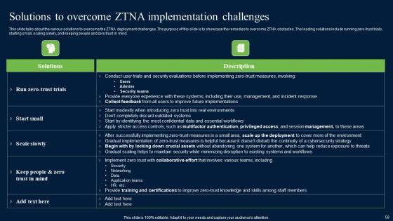 This slide talks about the various solutions to overcome the ZTNA deployment challenges. The purpose of this slide is to showcase the remedies to overcome ZTNA obstacles. The leading solutions include running zero-trust trials, starting small, scaling slowly, and keeping people and zero trust in mind. Boost your pitch with our creative Solutions To Overcome ZTNA Implementation Challenges Zero Trust Network Security Designs Pdf. Deliver an awe-inspiring pitch that will mesmerize everyone. Using these presentation templates you will surely catch everyones attention. You can browse the ppts collection on our website. We have researchers who are experts at creating the right content for the templates. So you do not have to invest time in any additional work. Just grab the template now and use them. This slide talks about the various solutions to overcome the ZTNA deployment challenges. The purpose of this slide is to showcase the remedies to overcome ZTNA obstacles. The leading solutions include running zero-trust trials, starting small, scaling slowly, and keeping people and zero trust in mind.