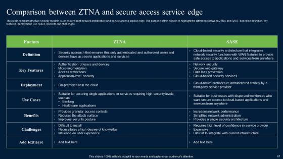 This slide compares the two security models, such as zero trust network architecture and secure access service edge. The purpose of this slide is to highlight the difference between ZTNA and SASE based on definition, key features, deployment, use cases, benefits and challenges. Slidegeeks is here to make your presentations a breeze with Comparison Between ZTNA And Secure Access Zero Trust Network Security Graphics Pdf With our easy-to-use and customizable templates, you can focus on delivering your ideas rather than worrying about formatting. With a variety of designs to choose from, you are sure to find one that suits your needs. And with animations and unique photos, illustrations, and fonts, you can make your presentation pop. So whether you are giving a sales pitch or presenting to the board, make sure to check out Slidegeeks first This slide compares the two security models, such as zero trust network architecture and secure access service edge. The purpose of this slide is to highlight the difference between ZTNA and SASE based on definition, key features, deployment, use cases, benefits and challenges.