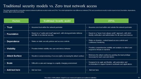 This slide represents the comparative analysis between traditional security models and ZTNA. This slide highlights the main differences between ZTNA and conventional security models based on trust, foundation, dependence, visibility, attack surface and scaling. If your project calls for a presentation, then Slidegeeks is your go-to partner because we have professionally designed, easy-to-edit templates that are perfect for any presentation. After downloading, you can easily edit Traditional Security Models Vs Zero Trust Network Access Security Mockup Pdf and make the changes accordingly. You can rearrange slides or fill them with different images. Check out all the handy templates This slide represents the comparative analysis between traditional security models and ZTNA. This slide highlights the main differences between ZTNA and conventional security models based on trust, foundation, dependence, visibility, attack surface and scaling.