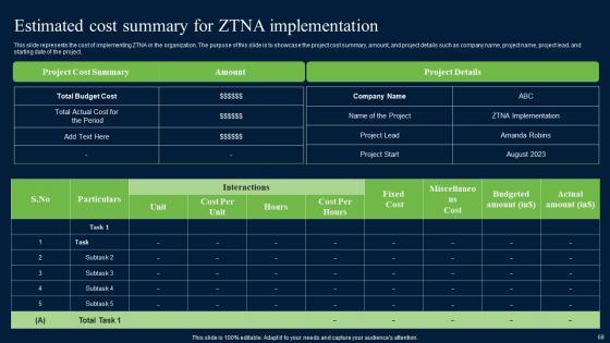 This slide represents the cost of implementing ZTNA in the organization. The purpose of this slide is to showcase the project cost summary, amount, and project details such as company name, project name, project lead, and starting date of the project. If you are looking for a format to display your unique thoughts, then the professionally designed Estimated Cost Summary For ZTNA Zero Trust Network Security Elements Pdf is the one for you. You can use it as a Google Slides template or a PowerPoint template. Incorporate impressive visuals, symbols, images, and other charts. Modify or reorganize the text boxes as you desire. Experiment with shade schemes and font pairings. Alter, share or cooperate with other people on your work. Download Estimated Cost Summary For ZTNA Zero Trust Network Security Elements Pdf and find out how to give a successful presentation. Present a perfect display to your team and make your presentation unforgettable. This slide represents the cost of implementing ZTNA in the organization. The purpose of this slide is to showcase the project cost summary, amount, and project details such as company name, project name, project lead, and starting date of the project.
