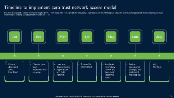 This slide showcases the timeline for implementing the ZTNA security model. This slide highlights the various steps organizations will take while deploying the ZTNA system, forming a dedicated team, choosing zero-trust implementation on-ramp, assessing the environment and so on. Slidegeeks is here to make your presentations a breeze with Timeline To Implement Zero Trust Network Security Themes Pdf With our easy-to-use and customizable templates, you can focus on delivering your ideas rather than worrying about formatting. With a variety of designs to choose from, you are sure to find one that suits your needs. And with animations and unique photos, illustrations, and fonts, you can make your presentation pop. So whether you are giving a sales pitch or presenting to the board, make sure to check out Slidegeeks first This slide showcases the timeline for implementing the ZTNA security model. This slide highlights the various steps organizations will take while deploying the ZTNA system, forming a dedicated team, choosing zero-trust implementation on-ramp, assessing the environment and so on.