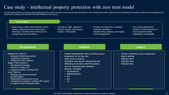 This slide represents the case study for implementing the ZTNA security model into a food and beverage organization to secure intellectual property, supply chain and manufacturing. The purpose of this slide is to highlight the key requirements, solutions and impact of ZTNA implementation on the business. Want to ace your presentation in front of a live audience Our Case Study Intellectual Property Protection With Zero Trust Network Security Inspiration Pdf can help you do that by engaging all the users towards you. Slidegeeks experts have put their efforts and expertise into creating these impeccable powerpoint presentations so that you can communicate your ideas clearly. Moreover, all the templates are customizable, and easy-to-edit and downloadable. Use these for both personal and commercial use. This slide represents the case study for implementing the ZTNA security model into a food and beverage organization to secure intellectual property, supply chain and manufacturing. The purpose of this slide is to highlight the key requirements, solutions and impact of ZTNA implementation on the business.