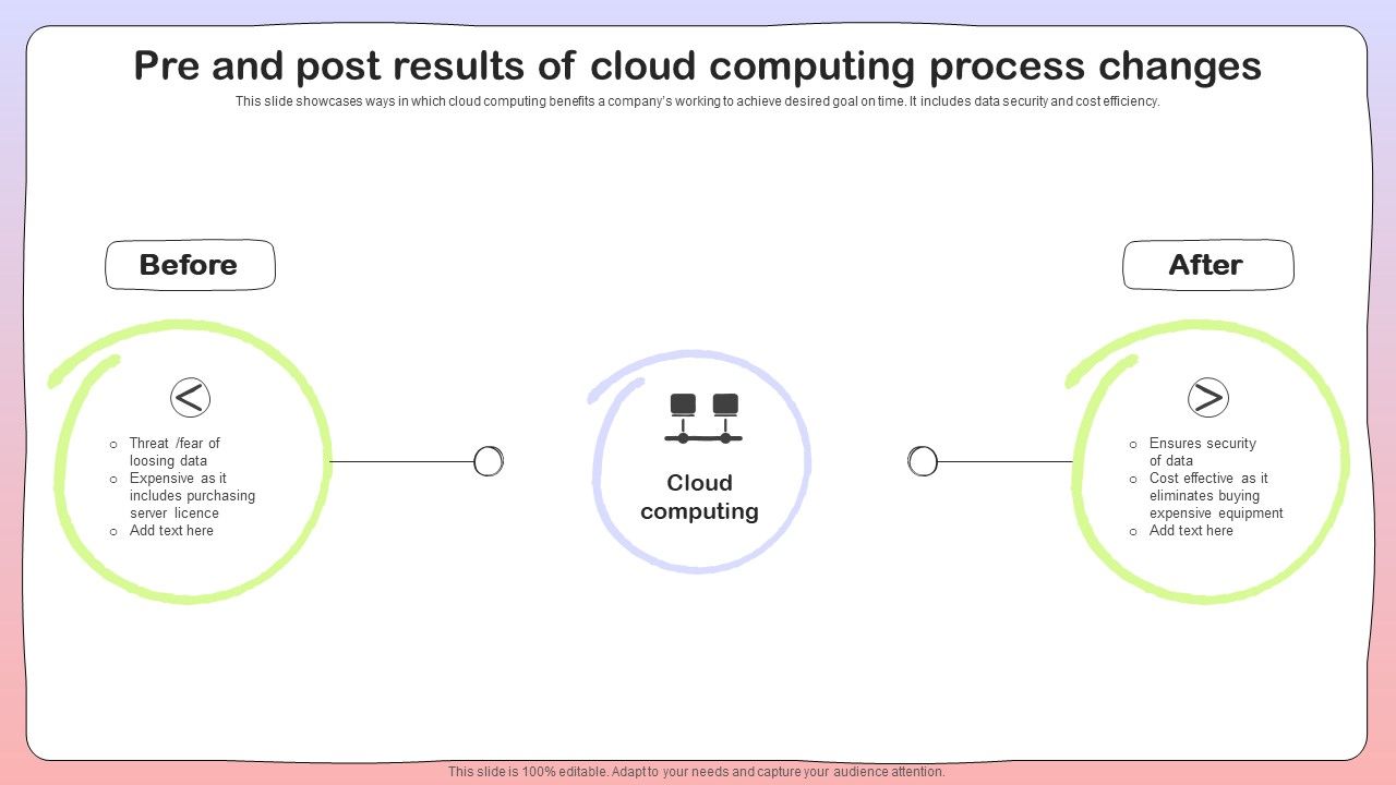 This slide showcases ways in which cloud computing benefits a companys working to achieve desired goal on time. It includes data security and cost efficiency. Persuade your audience using this Pre And Post Results Of Cloud Computing Process Changes Graphics PDF. This PPT design covers two stages, thus making it a great tool to use. It also caters to a variety of topics including Cloud Computing, Expensive Equipment, Includes Purchasing. Download this PPT design now to present a convincing pitch that not only emphasizes the topic but also showcases your presentation skills.