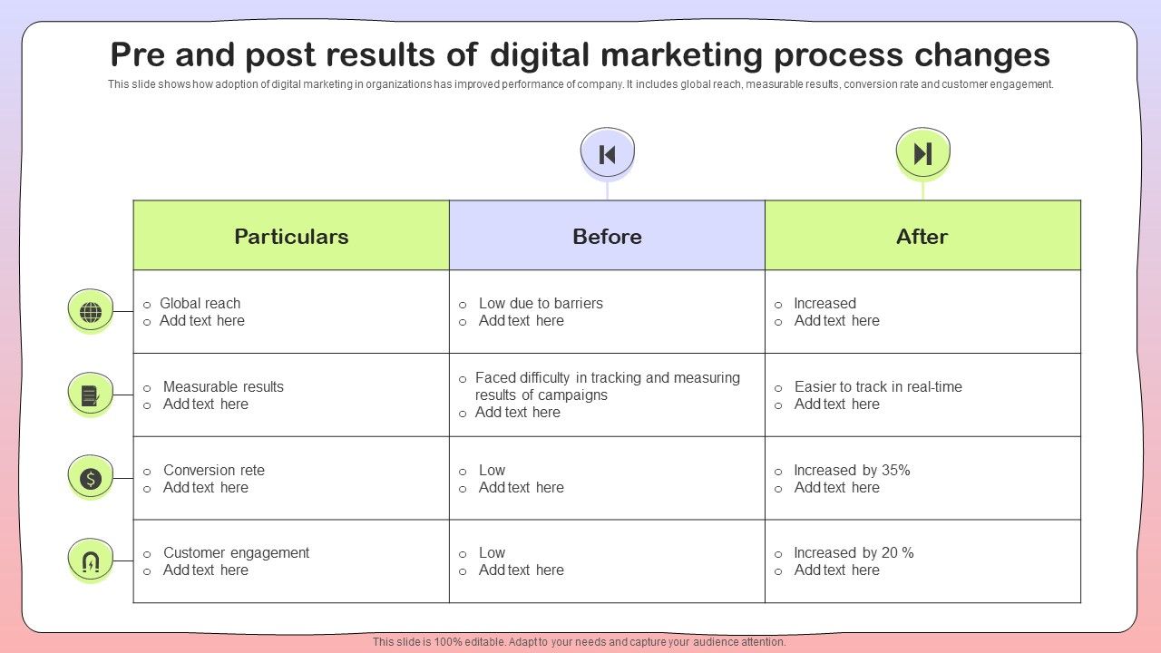 This slide shows how adoption of digital marketing in organizations has improved performance of company. It includes global reach, measurable results, conversion rate and customer engagement. Showcasing this set of slides titled Pre And Post Results Of Digital Marketing Process Changes Demonstration PDF. The topics addressed in these templates are Results, Digital Marketing, Changes. All the content presented in this PPT design is completely editable. Download it and make adjustments in color, background, font etc. as per your unique business setting.
