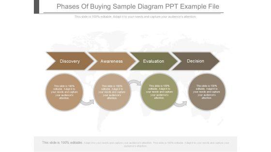This is a phases of buying sample diagram ppt example file. This is a four stage process. The stages in this process are discovery, awareness, evaluation, decision.