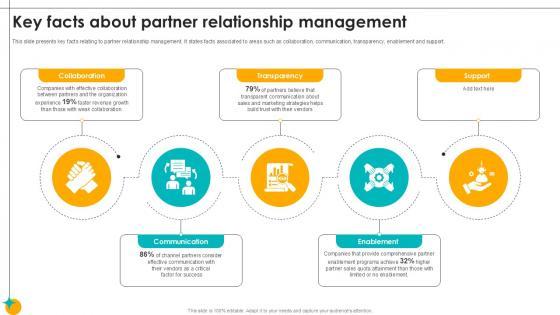 This slide presents key facts relating to partner relationship management. It states facts associated to areas such as collaboration, communication, transparency, enablement and support. Want to ace your presentation in front of a live audience Our Key Facts About Partner Relationship Management Partner Relationship Ppt Template can help you do that by engaging all the users towards you. Slidegeeks experts have put their efforts and expertise into creating these impeccable powerpoint presentations so that you can communicate your ideas clearly. Moreover, all the templates are customizable, and easy-to-edit and downloadable. Use these for both personal and commercial use.
