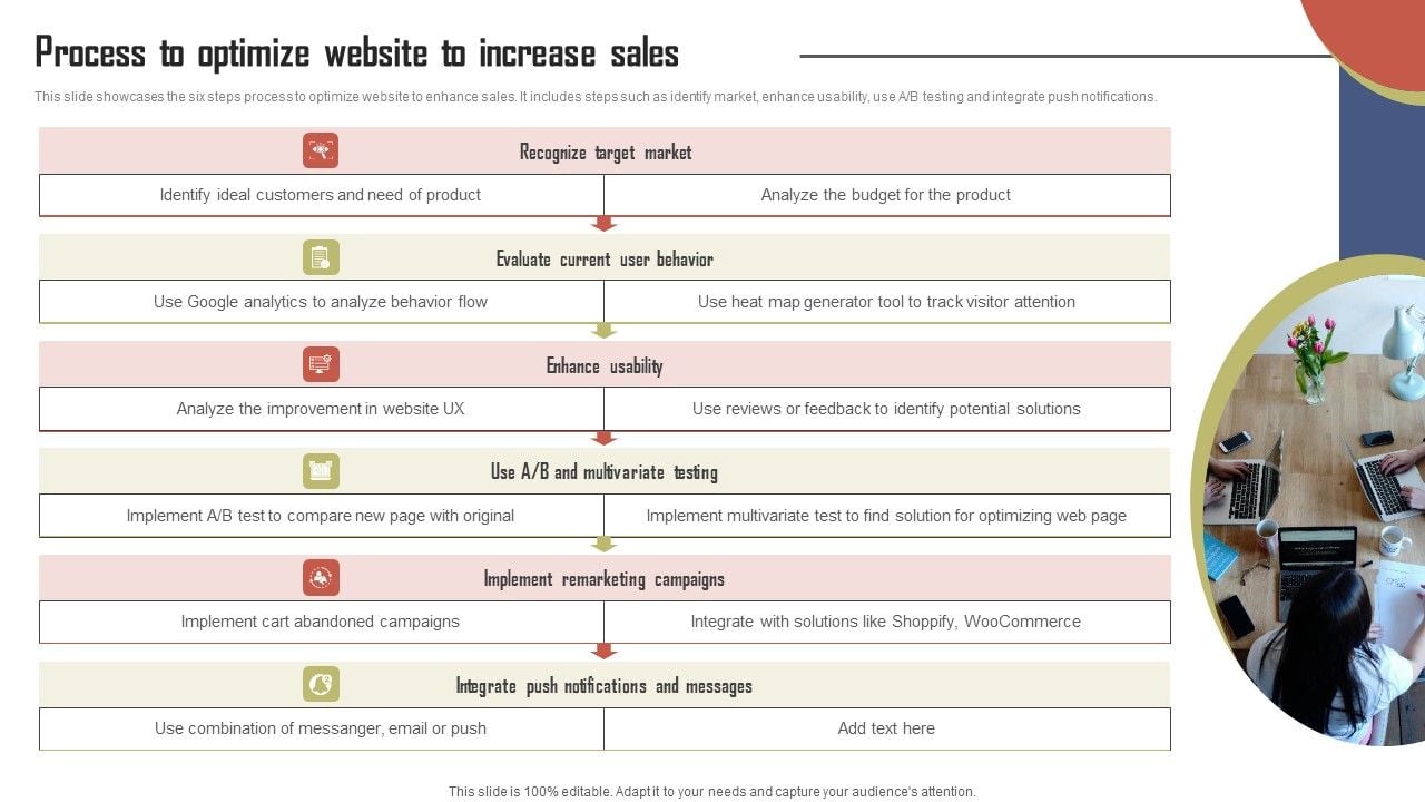 This slide showcases the six steps process to optimize website to enhance sales. It includes steps such as identify market, enhance usability, use A B testing and integrate push notifications. Do you have to make sure that everyone on your team knows about any specific topic I yes, then you should give Process To Optimize Website To Increase Sales Effective Travel Marketing Guide For Improving Download PDF a try. Our experts have put a lot of knowledge and effort into creating this impeccable Process To Optimize Website To Increase Sales Effective Travel Marketing Guide For Improving Download PDF. You can use this template for your upcoming presentations, as the slides are perfect to represent even the tiniest detail. You can download these templates from the Slidegeeks website and these are easy to edit. So grab these today