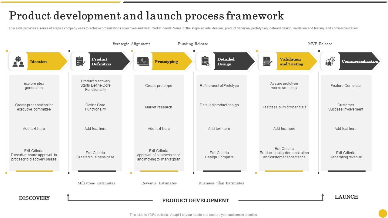This slide provides a series of steps a company uses to achieve organizations objectives and meet market needs. Some of the steps include ideation, product definition, prototyping, detailed design, validation and testing, and commercialization. Presenting Product Development And Launch Process Framework Topics PDF to dispense important information. This template comprises six stages. It also presents valuable insights into the topics including Ideation, Product Definition, Prototyping. This is a completely customizable PowerPoint theme that can be put to use immediately. So, download it and address the topic impactfully.