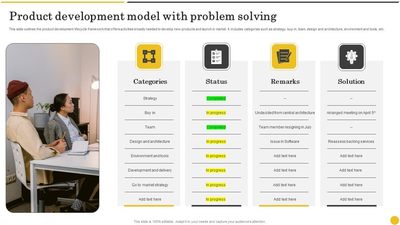 This slide outlines the product development lifecycle framework that offers activities broadly needed to develop new products and launch in market. It includes categories such as strategy, buy-in, team, design and architecture, environment and tools, etc. Presenting Product Development Model With Problem Solving Ideas PDF to dispense important information. This template comprises one stages. It also presents valuable insights into the topics including Strategy, Remarks, Design Architecture . This is a completely customizable PowerPoint theme that can be put to use immediately. So, download it and address the topic impactfully.