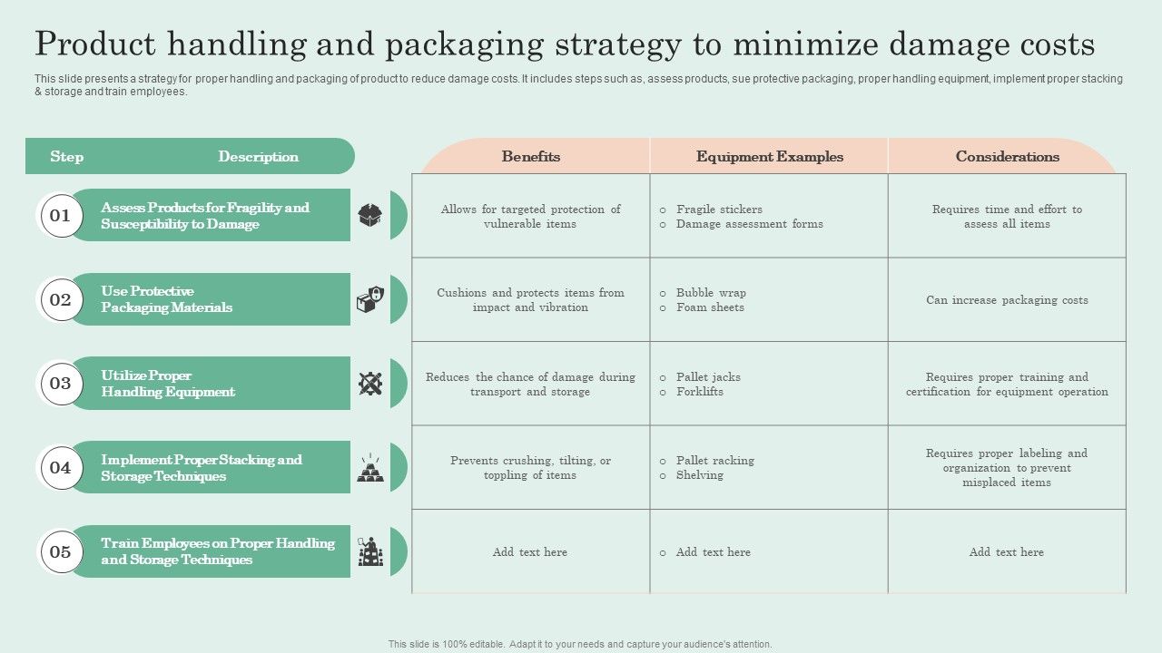 This slide presents a strategy for proper handling and packaging of product to reduce damage costs. It includes steps such as, assess products, sue protective packaging, proper handling equipment, implement proper stacking and storage and train employees. Do you have an important presentation coming up Are you looking for something that will make your presentation stand out from the rest Look no further than Product Handling And Packaging Strategy To Minimize Damage Costs Template PDF. With our professional designs, you can trust that your presentation will pop and make delivering it a smooth process. And with Slidegeeks, you can trust that your presentation will be unique and memorable. So why wait Grab Product Handling And Packaging Strategy To Minimize Damage Costs Template PDF today and make your presentation stand out from the rest
