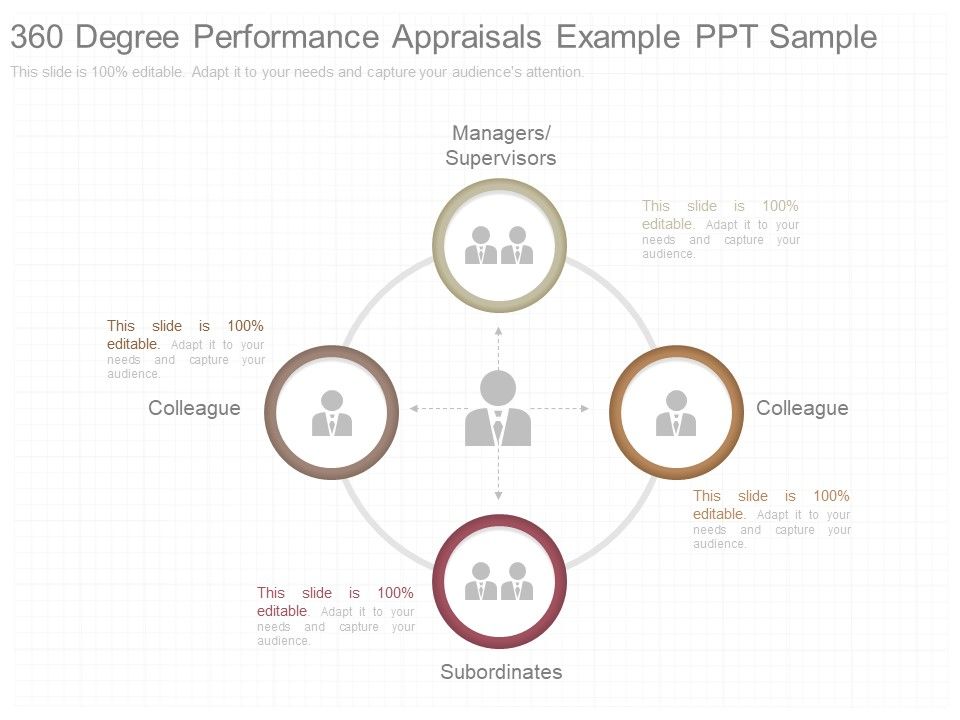 This is a 360 degree performance appraisals example ppt sample. This is a four stage process. The stages in this process are managers supervisors, colleague, subordinates.