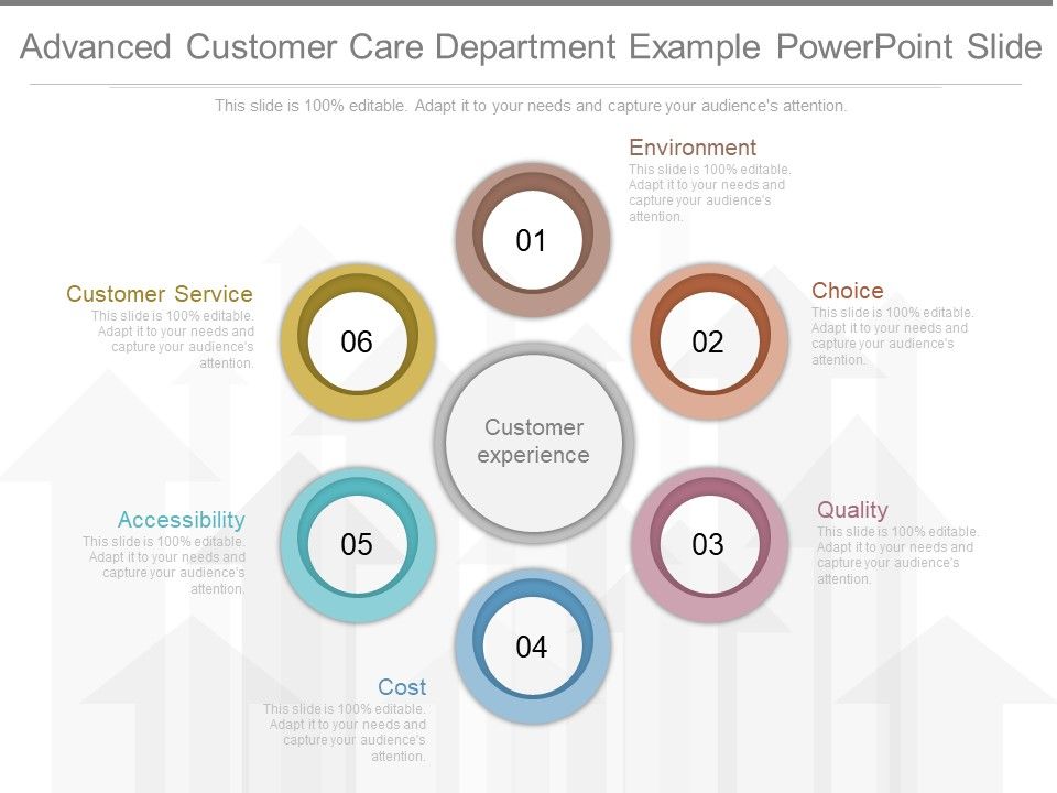 This is a advanced customer care department example powerpoint slide. This is a six stage process. The stages in this process are environment, choice, quality, cost, accessibility, customer service.