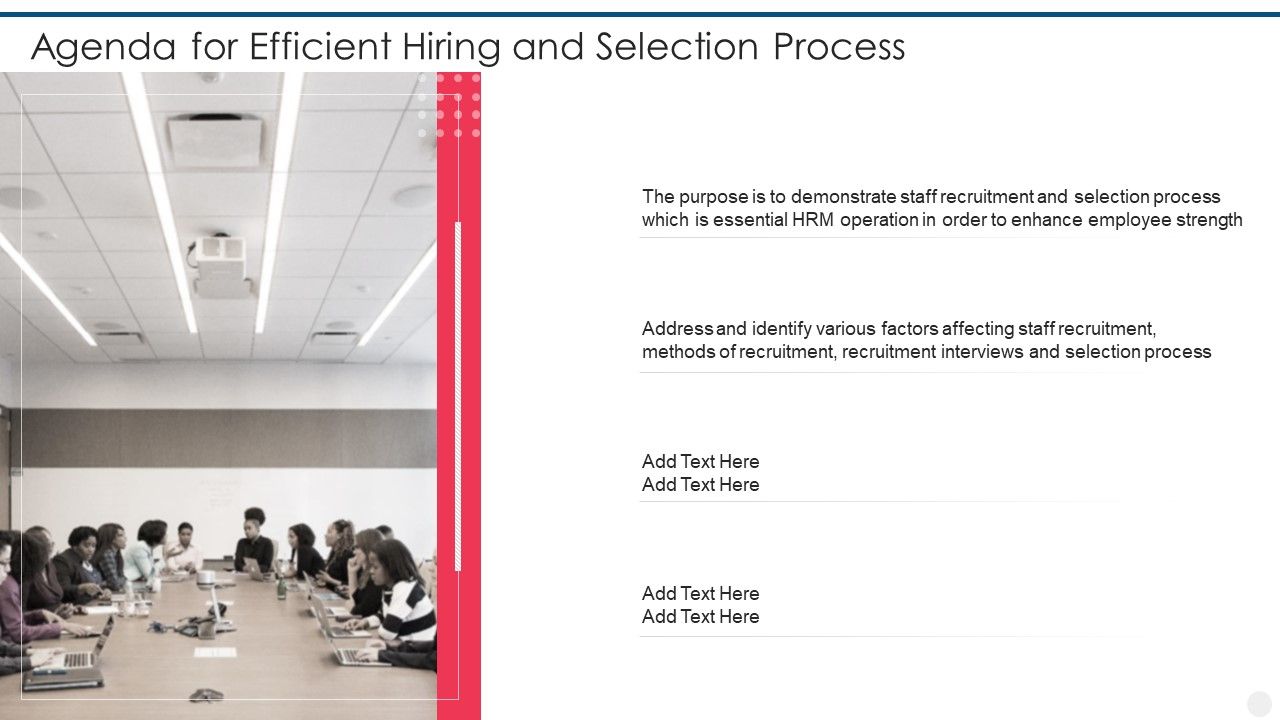 This is a Agenda For Efficient Hiring And Selection Process Demonstration PDF template with various stages. Focus and dispense information on one stages using this creative set, that comes with editable features. It contains large content boxes to add your information on topics like Demonstrate Staff, HRM Operation, Enhance Employee. You can also showcase facts, figures, and other relevant content using this PPT layout. Grab it now.