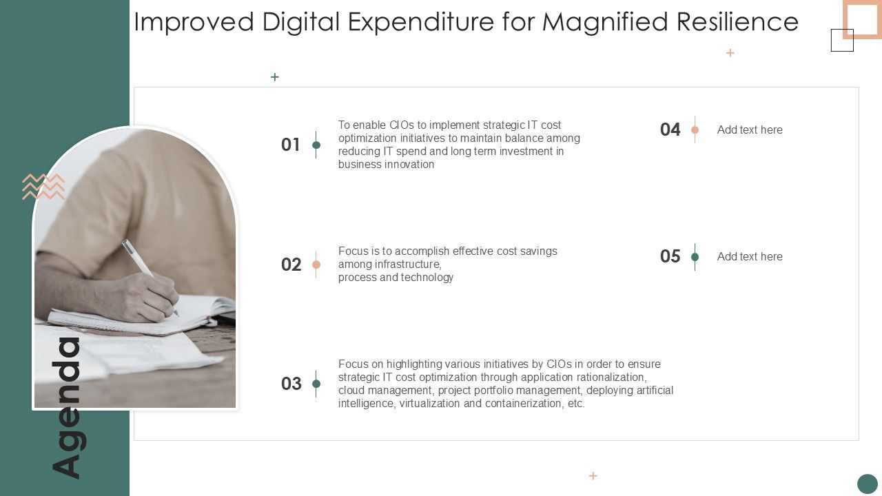 Presenting Agenda Improved Digital Expenditure For Magnified Resilience Portrait PDF to provide visual cues and insights. Share and navigate important information on five stages that need your due attention. This template can be used to pitch topics like Agenda. In addtion, this PPT design contains high resolution images, graphics, etc, that are easily editable and available for immediate download.