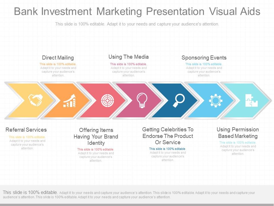 This is a bank investment marketing presentation visual aids. This is a seven stage process. The stages in this process are direct mailing, using the media, sponsoring events, referral services, offering items having your brand identity, getting celebrities to endorse the product or service, using permission based marketing.