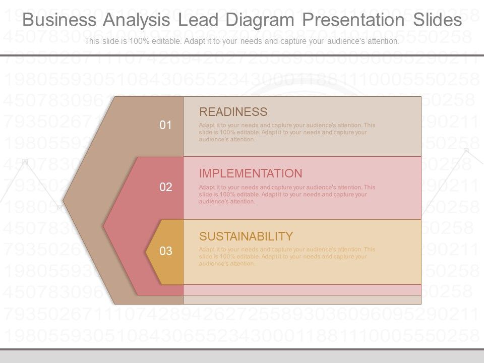 This is a business analysis lead diagram presentation slides. This is a three stage process. The stages in this process are readiness, implementation, sustainability.