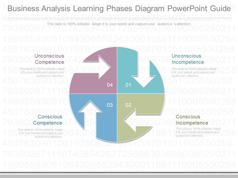 This is a business analysis learning phases diagram powerpoint guide. This is a four stage process. The stages in this process are unconscious competence, unconscious incompetence, conscious competence, conscious incompetence.